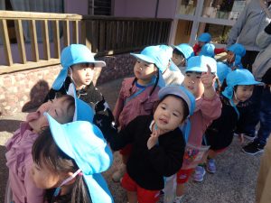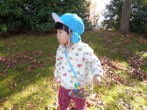 自分で作ったお散歩バッグを身につけ「がんばるぞ~えい えい お~!!」と