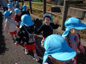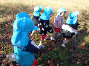 かけ声をして、わくわくとした表情で歩く子どもたち。