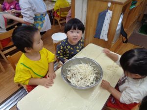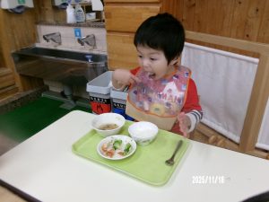給食の時間になると「見て~えのきあった!」や「美味しい」と