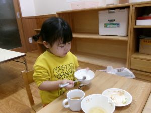 スプーンですくいにくいきのこも何度も挑戦してすくおうとする姿や