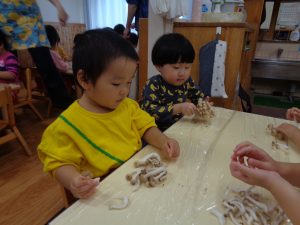 束になっているしめじやえのきをちぎりとって、夢中になって