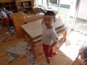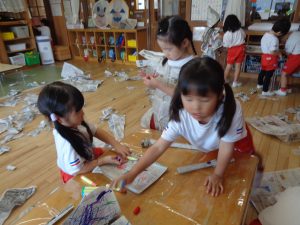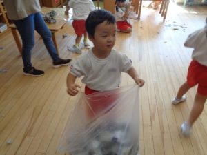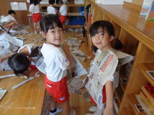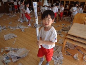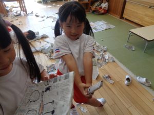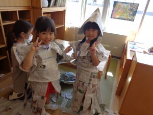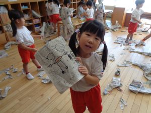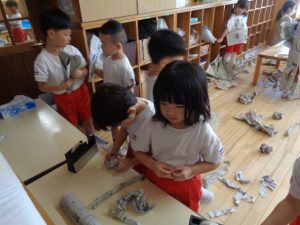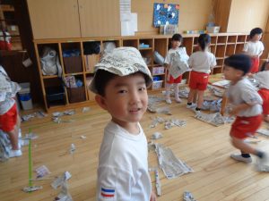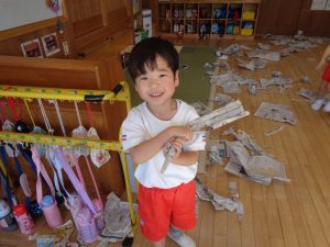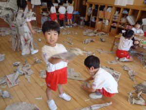 紙飛行機を作って飛ばしたり、保育者や友だちと一緒に