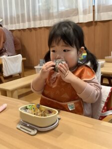 嬉しそうにおにぎりを頬張ったり、大きな口を開けて