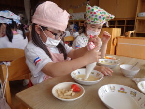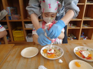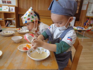 生地の上にクリームや果物をのせる工程では「えっ、ぜんぶのせていいの?やったー!」と